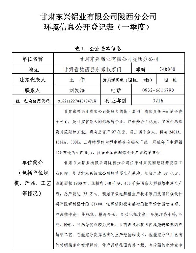 甘肅東興鋁業(yè)有限公司隴西分環(huán)境信息公開登記表 (一季度)