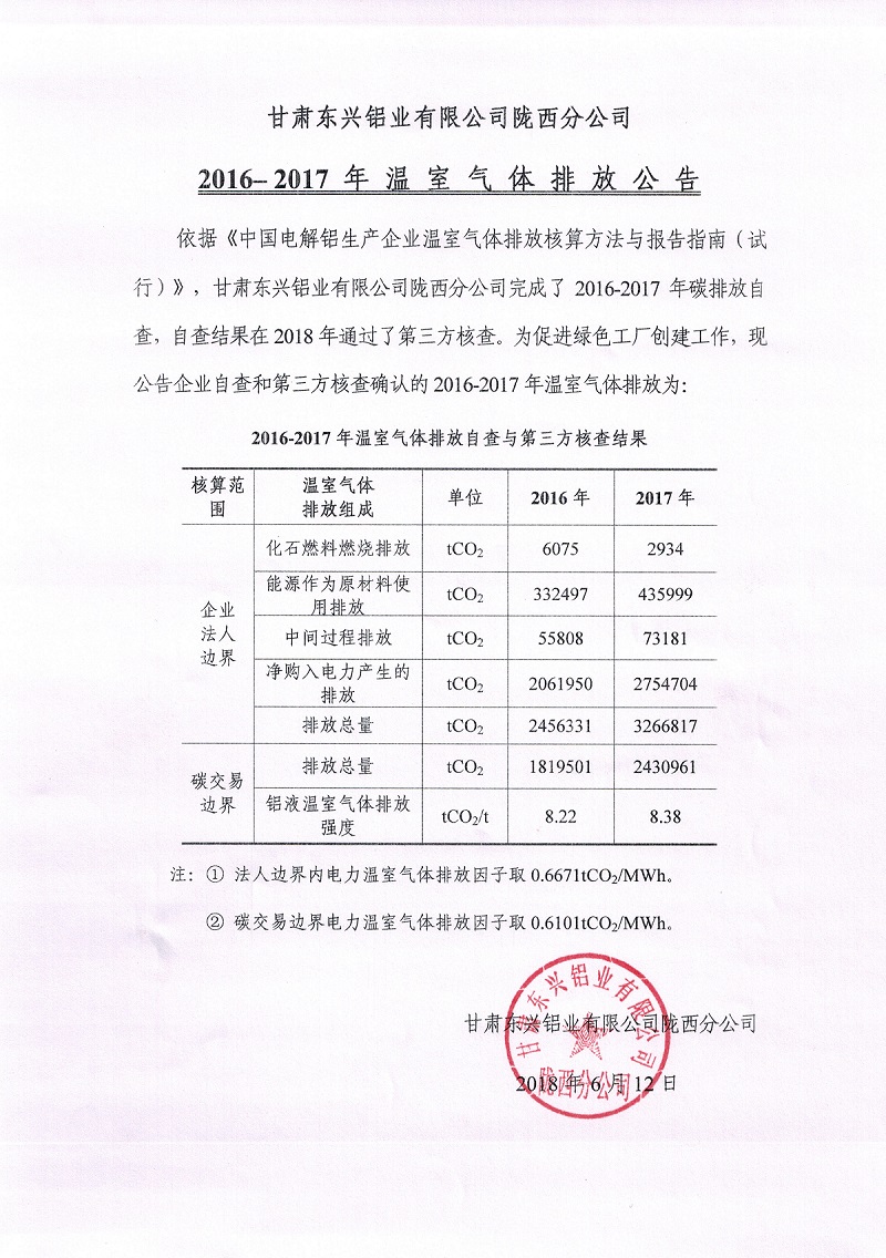 關(guān)于甘肅東興鋁業(yè)有限公司隴西分公司2016-2017年溫室氣體排放公告公示