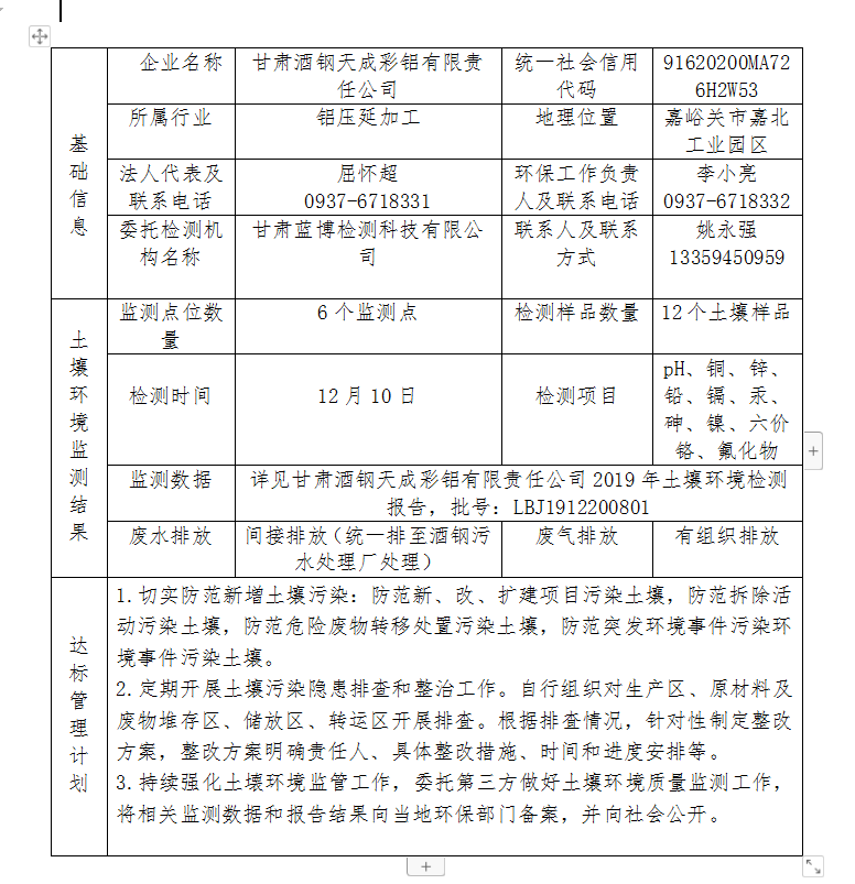 甘肅酒鋼天成彩鋁有限責(zé)任公司 土壤環(huán)境重點(diǎn)監(jiān)管企業(yè)自行監(jiān)測(cè)信息公開表