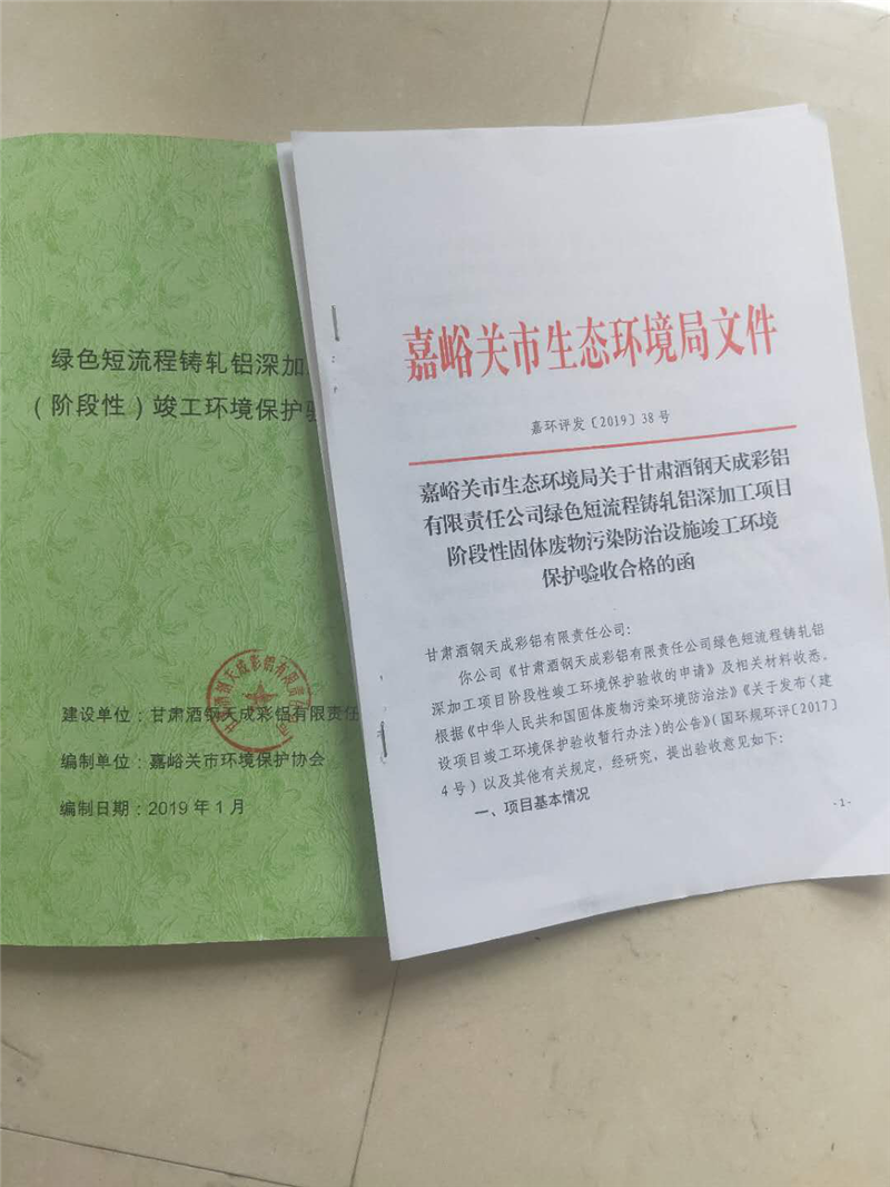 我公司環(huán)境影響報(bào)告書均通過省生態(tài)環(huán)境廳與市生態(tài)環(huán)境局審批,于2016年11月2日取得《嘉峪關(guān)市環(huán)境保護(hù)局關(guān)于酒鋼天成彩鋁有限責(zé)任公司綠色短流程鑄軋鋁深加工項(xiàng)目環(huán)境影響報(bào)告書的批復(fù)》嘉環(huán)評【2016】132號(hào)。并在2019年3月4日通過環(huán)保建設(shè)項(xiàng)目“三同時(shí)”(階段性)驗(yàn)收,并取得環(huán)境保護(hù)驗(yàn)收合格函。
