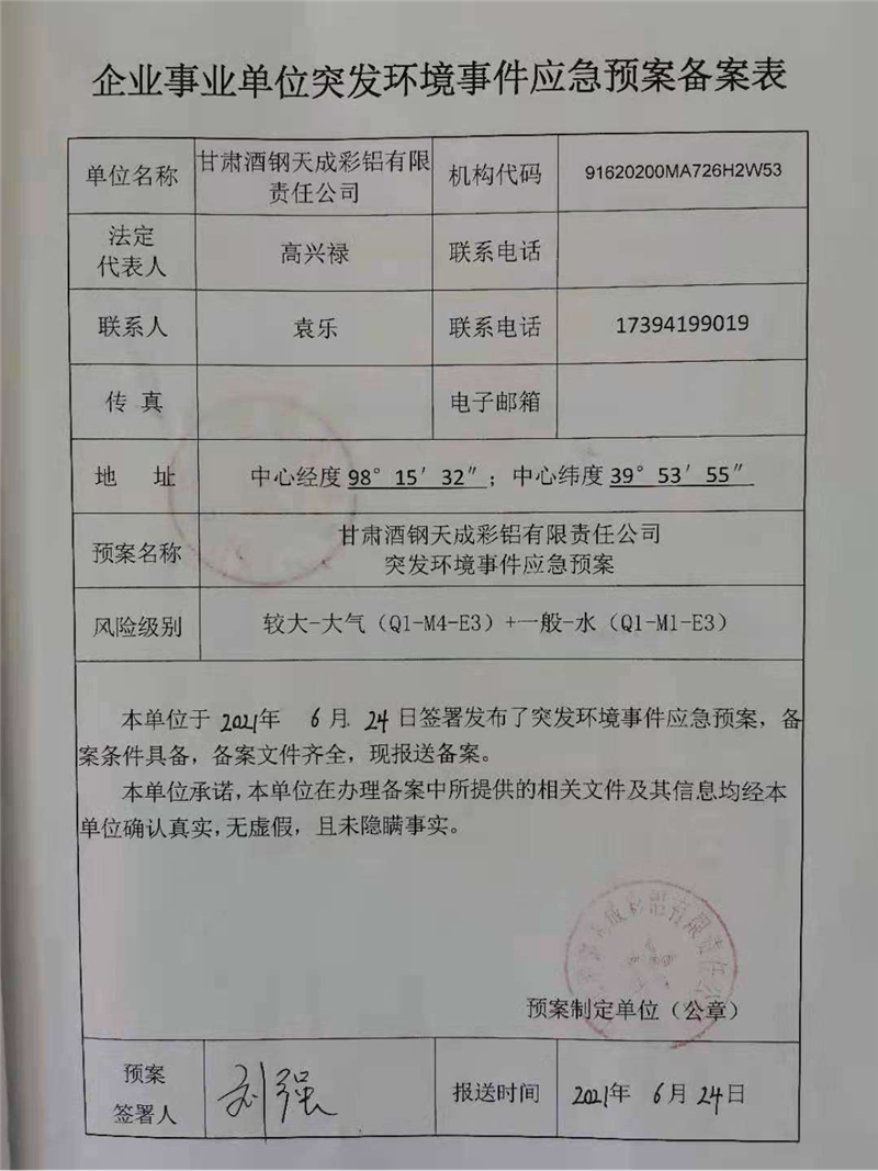 1.應(yīng)急預(yù)案名稱:甘肅酒鋼天成彩鋁有限責(zé)任公司突發(fā)